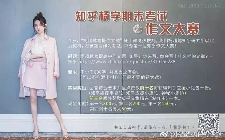 杨超越可能是现在粉丝构成最复杂的偶像。不只是编程大赛,之前还有知乎杨学期末考试作文大赛:
