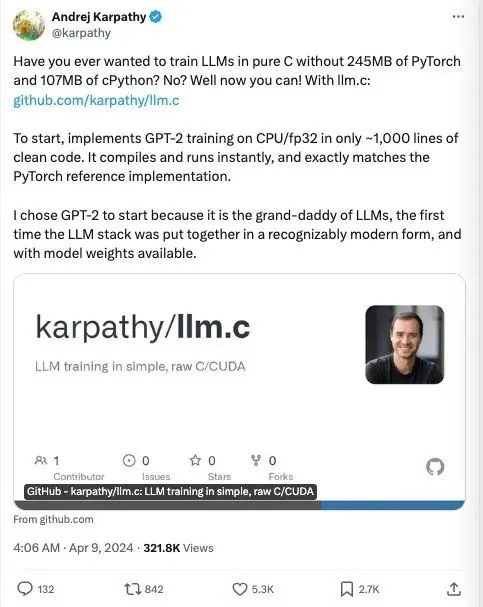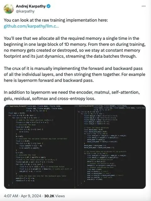 如今这年头,徒手写神经网络代码已经不算事儿了,现在流行手搓大模型训练代码了!这不,今天,特斯拉前 AI 总监、OpenAI 创始团队成员 Andrej Karpathy 仅用 1000 行简洁的 C 代码,就完成了 GPT-2 大模型训练过程。
