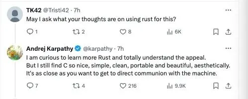 有网友问 Karpathy 为何不用 Rust,Karpathy 回复说,“我完全理解 Rust 的吸引力。然而,我仍然觉得 C 语言非常棒。它简单、干净、可移植,在审美上也十分优美。使用 C 语言就像直接与机器交流一样。”