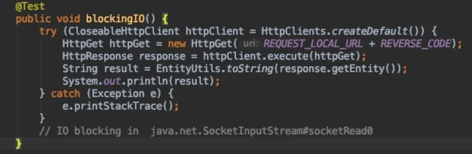 服务端响应之前,IO会阻塞在:java.net.SocketInputStream#socketRead0 的native方法上: