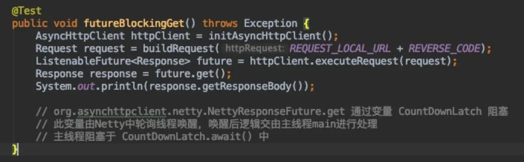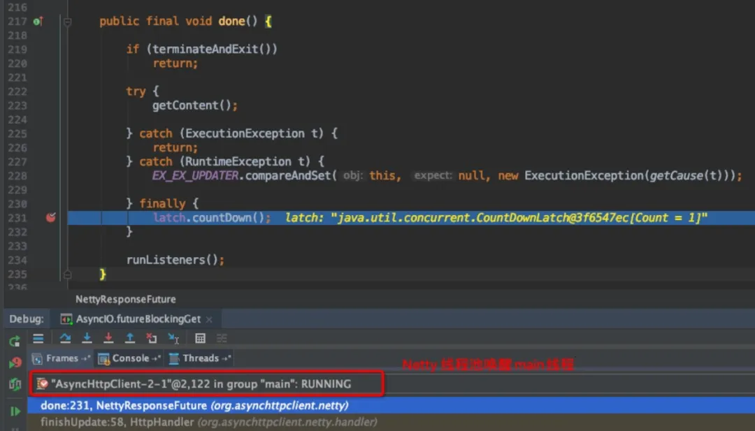 当然并不是所有的Future都是这样实现的,如 io.netty.util.concurrent.AbstractFuture 就是通过线程轮询去。这样做的好处是,主线程可以不用等待IO响应,可以去做点其他的,比如说再发送一个IO请求,可以等到一起返回:"main"#1 prio=5 os_prio=31 tid=0x00007fd7a500b000 nid=0xe03 waiting on condition [0x000070000a95d000] java.lang.Thread.State: WAITING (parking) at sun.misc.Unsafe.park(Native Method)- parking to wait for <0x000000076ee2d768> (a java.util.concurrent.CountDownLatch$Sync) at java.util.concurrent.locks.LockSupport.park(LockSupport.java:175) at java.util.concurrent.locks.AbstractQueuedSynchronizer.parkAndCheckInterrupt(AbstractQueuedSynchronizer.java:836) at java.util.concurrent.locks.AbstractQueuedSynchronizer.doAcquireSharedInterruptibly(AbstractQueuedSynchronizer.java:997) at java.util.concurrent.locks.AbstractQueuedSynchronizer.acquireSharedInterruptibly(AbstractQueuedSynchronizer.java:1304) at java.util.concurrent.CountDownLatch.await(CountDownLatch.java:231) at org.asynchttpclient.netty.NettyResponseFuture.get(NettyResponseFuture.java:162) at com.amap.aos.async.AsyncIO.futureBlockingGet(AsyncIO.java:201) ....."AsyncHttpClient-2-1"#11 prio=5 os_prio=31 tid=0x00007fd7a7247800 nid=0x340b runnable [0x000070000ba94000] java.lang.Thread.State: RUNNABLE at sun.nio.ch.KQueueArrayWrapper.kevent0(Native Method) at sun.nio.ch.KQueueArrayWrapper.poll(KQueueArrayWrapper.java:198) at sun.nio.ch.KQueueSelectorImpl.doSelect(KQueueSelectorImpl.java:117) at sun.nio.ch.SelectorImpl.lockAndDoSelect(SelectorImpl.java:86)- locked <0x000000076eb00ef0> (a io.netty.channel.nio.SelectedSelectionKeySet)- locked <0x000000076eb00f10> (a java.util.Collections$UnmodifiableSet)- locked <0x000000076eb00ea0> (a sun.nio.ch.KQueueSelectorImpl) at sun.nio.ch.SelectorImpl.select(SelectorImpl.java:97) at io.netty.channel.nio.NioEventLoop.select(NioEventLoop.java:693) at io.netty.channel.nio.NioEventLoop.run(NioEventLoop.java:353) at io.netty.util.concurrent.SingleThreadEventExecutor$2.run(SingleThreadEventExecutor.java:140) at io.netty.util.concurrent.DefaultThreadFactory$DefaultRunnableDecorator.run(DefaultThreadFactory.java:144) at java.lang.Thread.run(Thread.java:748)