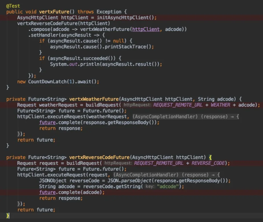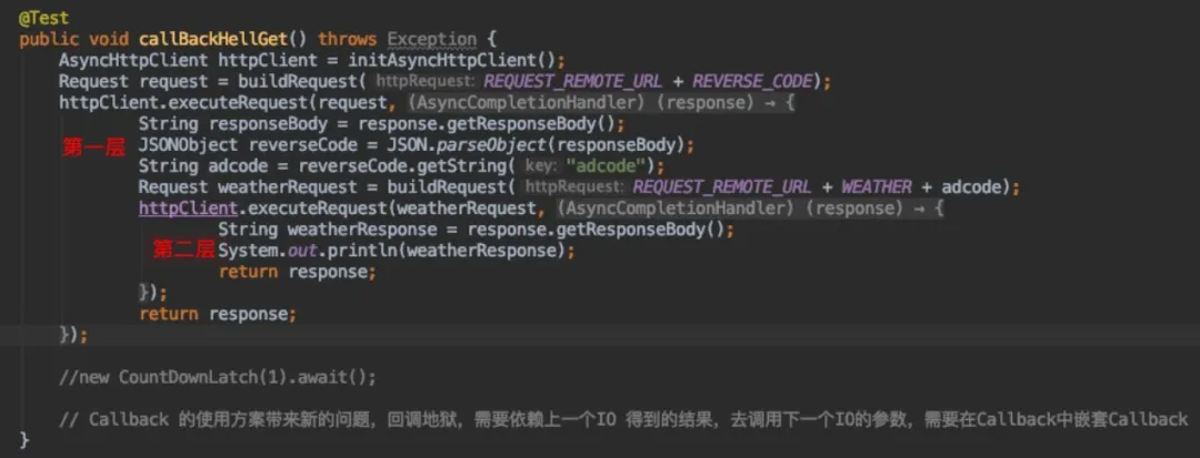 使用Callback方式,从线程模型中看,发现线程资源已经得到了比较充分的利用,整个过程中已经没有线程阻塞。回调地狱,当Callback的线程还需要执行下一个IO调用的时候,这个时候进入回调地狱模式。典型的应用场景如,通过经纬度获取行政区域adcode(逆地理接口),然后再根据获得的adcode,获取当地的天气信息(天气接口)。