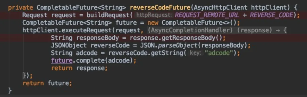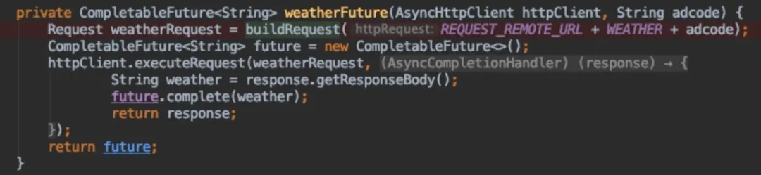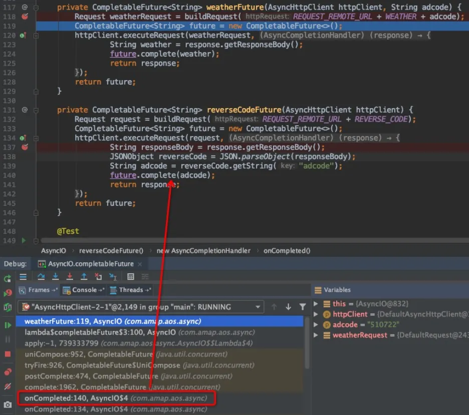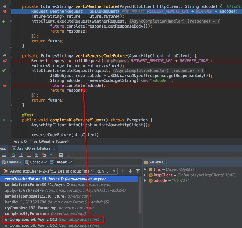 每一个IO操作,均可以封装为独立的CompletableFuture,从而避免回调地狱。CompletableFuture,只有两个属性:weatherFuture这个方法是如何被调用的呢?通过堆栈可以发现,是在 reverseCodeFuture.complete(result) 的时候,并且也将获得的adcode作为参数执行接下来的逻辑。