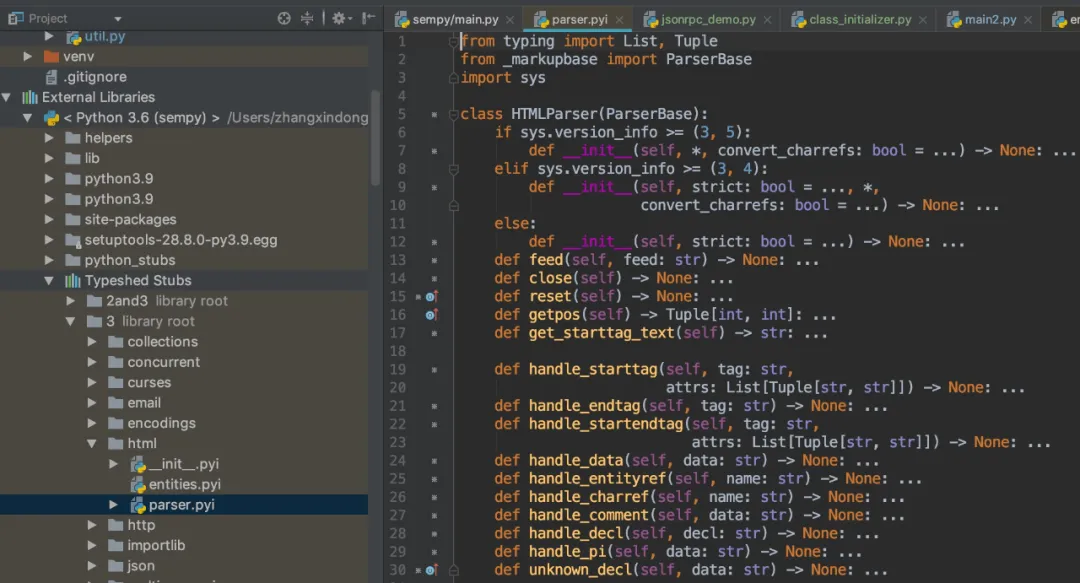 最早的官方推出的mypy是由Python之父Guido van Rossum亲自开发,被各种主流编辑器所集成(如PyCharm, Emacs, Sublime Text, VS Code等),用户基础和文档经验都很丰富。谷歌的pytype可以做类型检查,并且提供了一些实用小工具,下文会简单介绍下其应用:微软的pyright是最晚开源推出的,宣称有以下优点:接下来重点介绍一下pytype。为什么选取pytype呢,首先mypy比较古老,很多功能没有新出的工具新颖和实用。计划使用Python LSP来处理Python文件提供一些语法服务的功能,pyre-check用的是Ocamel,所以我们就拿Python语言的pytype来实现想要的功能,而且pytype提供了一些实用工具,比如解析一个pyi文件,基于Python文件生成pyi文件等。pyi的“i”指的是interfiace,将Python文件的类型定义用接口的形式存储到pyi文件里,来辅助类型检查。大家常用的Pycharm,可以关注下项目空间的External Libraries > Python 3.6 > Typeshed Stubs里面就有许多内置的pyi文件,来辅助编码过程的类型提示和定位。