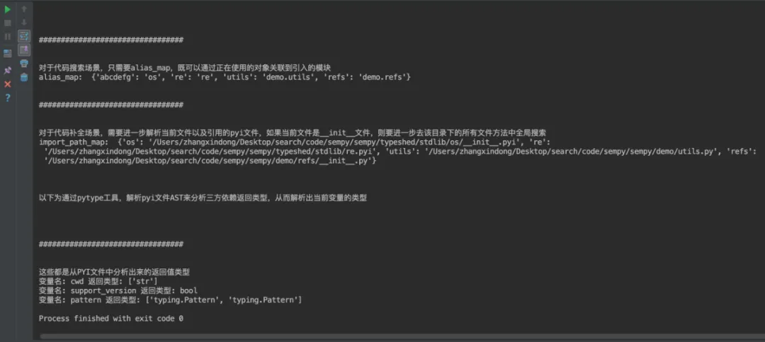 接下来,就是去具体解析对应的文件了。我的需求是获取一些方法的返回值类型,对于pyi文件,pytype能够帮助我们解析,然后我们通过调用关系去匹配。print('\n\n\n以下为通过pytype工具,解析pyi文件AST来分析三方依赖返回类型,从而解析出当前变量的类型\n\n')# 通过pytype的解析,去解析依赖的pyi文件,获得调用方法的返回值fname = '/path/to/parsed_file'with open(fname, 'r') as reader: lines = reader.readlines()sourcecode = '\n'.join(lines)ret = parser.parse_string(sourcecode, filename=fname, python_version=3)constant_map = dict()function_map = dict()for key in import_path_map.keys(): v = import_path_map[key] with open(v, 'r') as reader: lines = reader.readlines() src = '\n'.join(lines) try: res = parser.parse_pyi(src, v, key, 3) except: continue # Alias # Classes for constant in res.constants: constant_map[constant.name] = constant.type.name for function in res.functions: signatures = function.signatures sig_list = [] for signature in signatures: sig_list.append((signature.params, signature.return_type)) function_map[function.name] = sig_listvar_type_from_pyi_list = []for alias in ret.aliases: variable_name = alias.name if alias.type is not None: typename_in_source = alias.type.name typename = typename_in_source # 引入别名的case,把它转化回来 if '.' not in typename: # 只是普通的别名,不是函数调用的返回值,忽略 continue if typename.split('.')[0] in alias_map: real_module_name = alias_map[typename.split('.')[0]] typename = real_module_name + typename[typename.index('.'):] if typename in function_map: possible_return_types = [item[1].name for item in function_map[typename]] # print('The possible return type of', typename_in_source, 'is', possible_return_types) var_type_from_pyi_list.append((variable_name, possible_return_types)) if typename in constant_map: possible_return_type = constant_map[typename] var_type_from_pyi_list.append((variable_name, possible_return_type)) pass