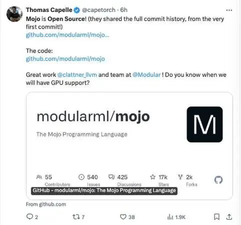 2024 年 3 月 29 日,Modular Inc. 宣布开源 Mojo 的核心组件。