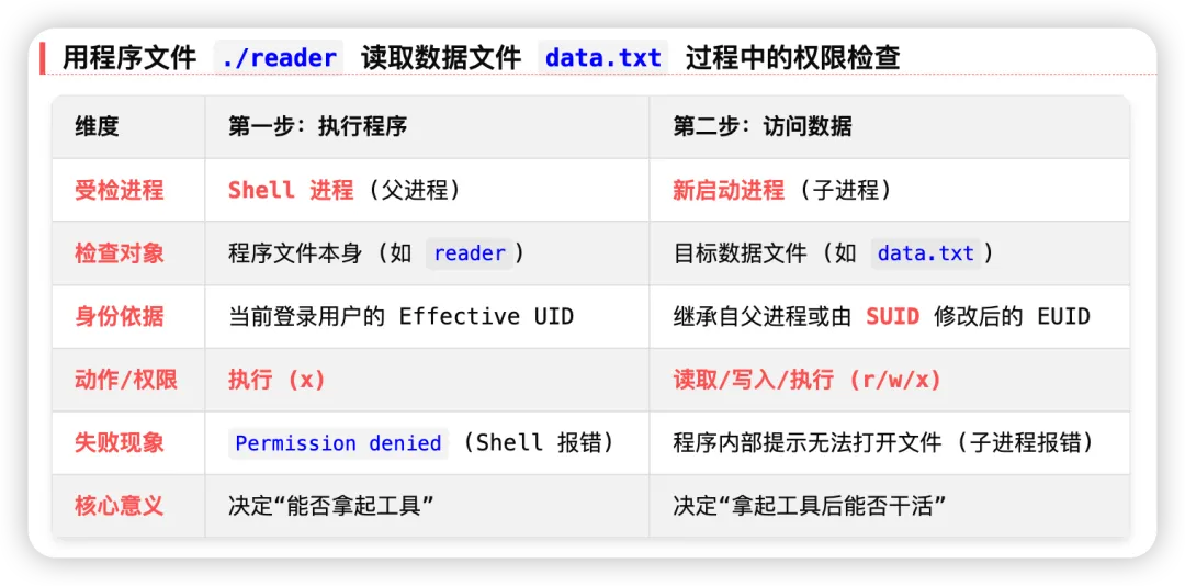 当你执行用程序文件 ./reader 读取数据文件 data.txt 时,并不是同一个进程在闯关。实际上,这是两个不同的进程先后接受了两次检查。