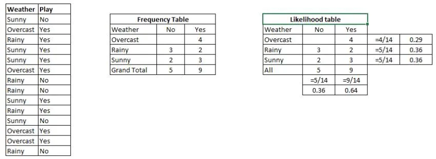 这里,P(Sunny |Yes) = 3/9 = 0.33, P(Sunny) = 5/14 = 0.36, P(Yes)= 9/14 = 0.64。