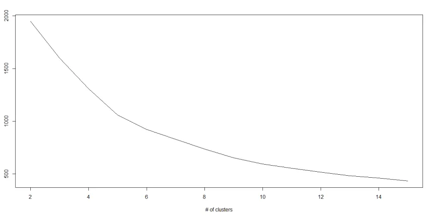 我们知道,随着集群数量的增加,总平方和会减少。但是如果用总平方和对K作图,你会发现在某个K值之前总平方和急速减少,但在这个K值之后减少的幅度大大降低,这个值就是最佳的集群数。