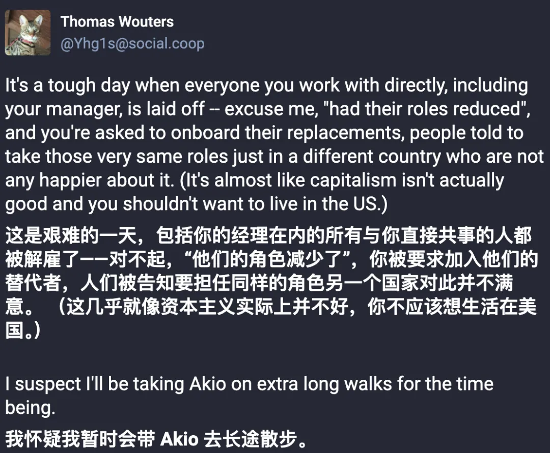 昨天晚上他在社交媒体发布动态称:包括自己在内的同事、主管均已被裁员。