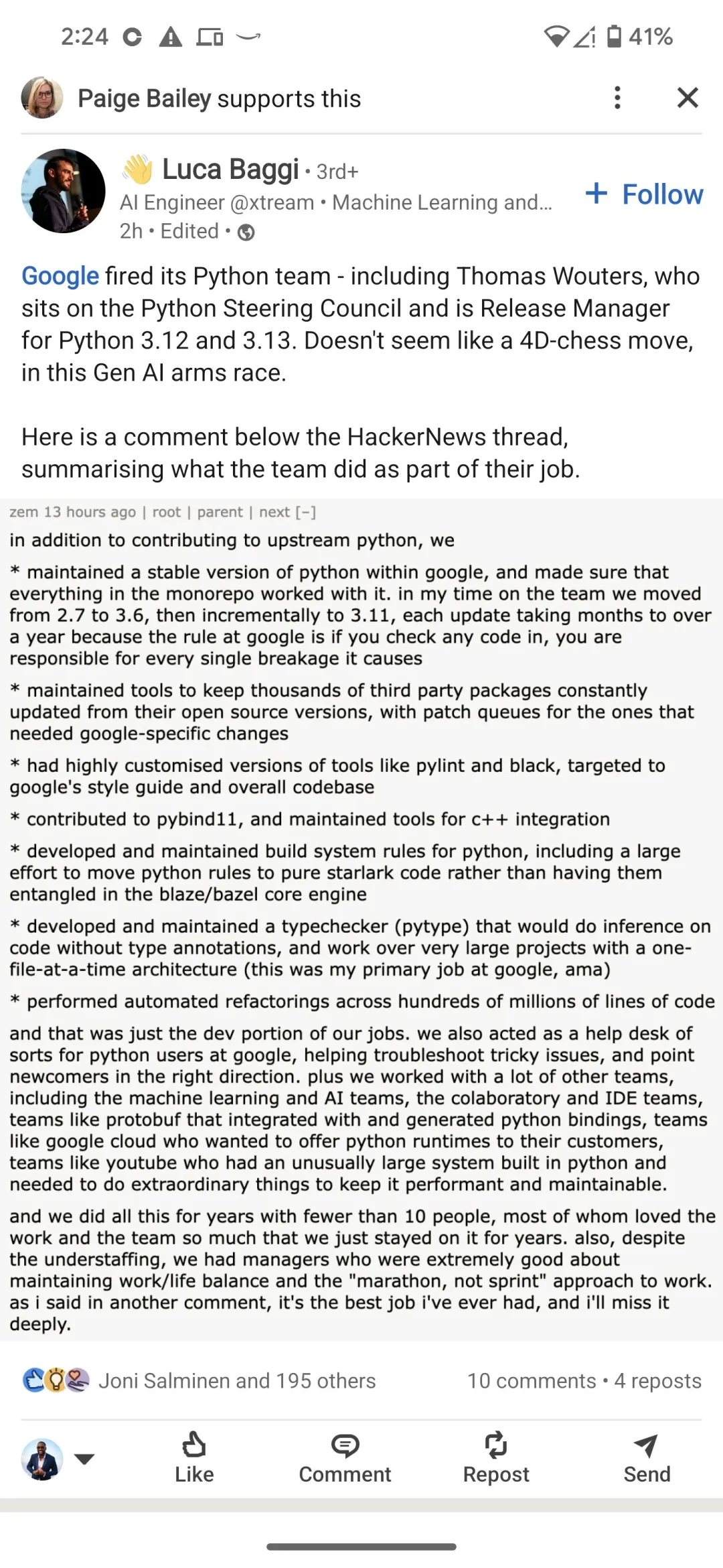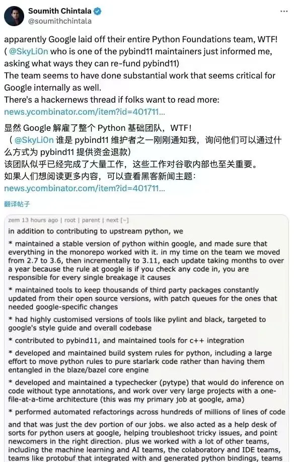 有其他网友补充道,是谷歌将 Python 团队负责的工作合并到另一个团队中,并让原来的团队离开。