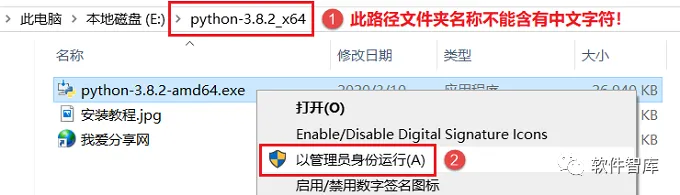 1.根据自己电脑系统的位数选择对应的Python_3.8.2软件安装包到电脑磁盘根目录或英文路径文件夹下,并解压缩,找到Python_3.8.2_x64.exe,鼠标右击选择【以管理员身份运行】,这里以64位版本为例