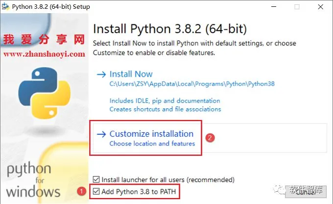 2.勾选“Add Python 3.8 to PATH”,然后点击【Customize installation】