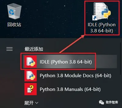 7.WIN10系统不自动创建桌面图标,点击桌面左下角“开始”按钮然后在弹出的右侧程序列中找到IDLE (Python 3.8 64-bit)快捷反思,鼠标左键按住不放拖拽至桌面生成图标