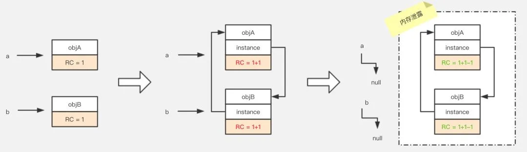 先创建一个字符串,这时候"jack"有一个引用,就是 m。然后将 m 设置为 null,这时候"jack"的引用次数就等于0了,在引用计数算法中,意味着这块内容就需要被回收了。引用计数算法是将垃圾回收分摊到整个应用程序的运行当中了,而不是在进行垃圾收集时,要挂起整个应用的运行,直到对堆中所有对象的处理都结束。因此,采用引用计数的垃圾收集不属于严格意义上的"Stop-The-World"的垃圾收集机制。看似很美好,但我们知道JVM的垃圾回收就是"Stop-The-World"的,那是什么原因导致我们最终放弃了引用计数算法呢?看下面的例子。public class ReferenceCountingGC { public Object instance; public ReferenceCountingGC(String name){}}public static void testGC(){ ReferenceCountingGC a = new ReferenceCountingGC("objA"); ReferenceCountingGC b = new ReferenceCountingGC("objB"); a.instance = b; b.instance = a; a = null; b = null;}
