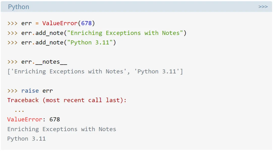 常规异常具有添加任意 notes 的扩展能力。你可以使用. add_note() 向任何异常添加一个 note,并通过检查.__notes__属性来查看现有 notes。