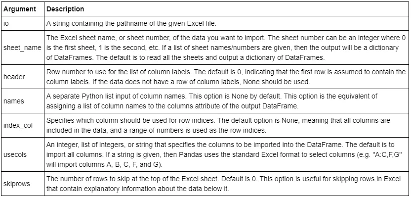 pandas.read_excel(io, sheet_name=0, header=0, names=None, index_col=None, parse_cols=None, usecols=None, squeeze=False, dtype=None, engine=None, converters=None, true_values=None, false_values=None, skiprows=None, nrows=None, na_values=None, keep_default_na=True, verbose=False, parse_dates=False, date_parser=None, thousands=None, comment=None, skip_footer=0, skipfooter=0, convert_float=True, mangle_dupe_cols=True, **kwds)