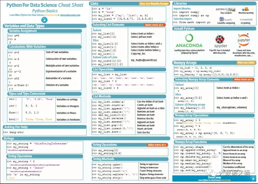 这张由Datacamp制作的小抄表覆盖了所有Python数据科学需要的基础知识。如果你刚开始用Python,可以留着这张做快速参考。背下这些小抄的代码变量、数据类型函数、字符串操作、类型转换、列表和常用操作。尤其是它列出了重要的Python包,给出了用于选择并导入包的小抄代码。
