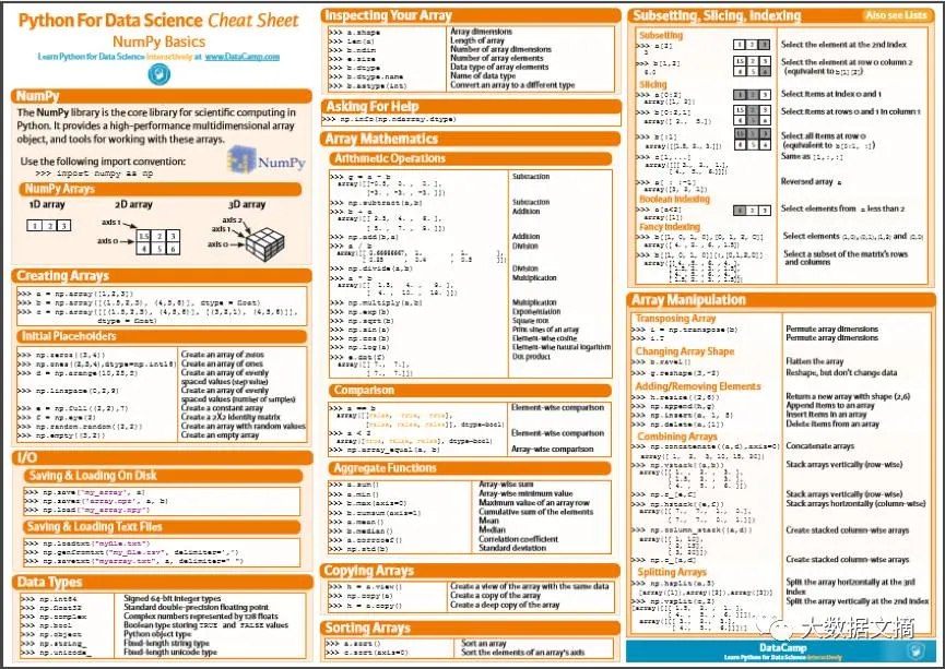 NumPy是Python用于科学计算的核心包。这又是一个由DataCamp制作的小抄表,你会找到用于创建NumPy数组的小抄代码,用于执行数学运算,构造子集、分层、索引和数组操作。这份小抄最特别的是它给每个函数做了分类,并用简单的英语做了解释说明。