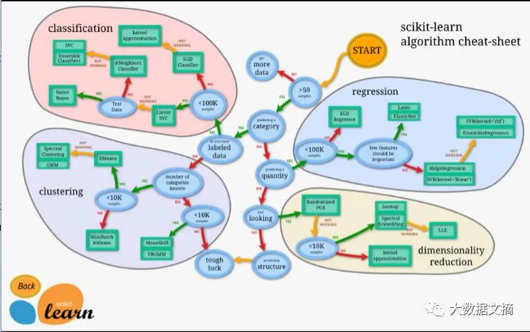 这份算法图是scikit-learn官方提供的。很多人都不知道如何选择特定的机器学习算法应对不同的数据类型和问题。有了这份图,你就清楚地了解完整的机器学习问题不同算法的区别。