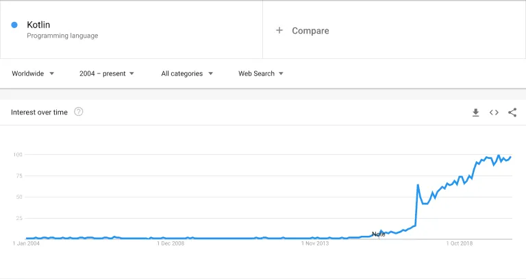 如果看一下谷歌趋势的话,我们能够看到在过去几年间,Kotlin 的流行程度: