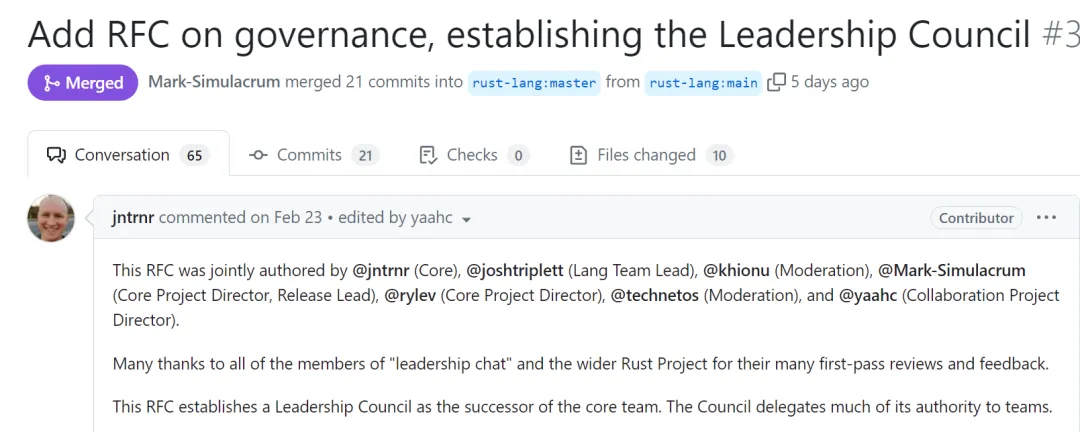 在经历了多次治理风波后, Rust 各团队成员合力创建了一份新的、名为 “ Rust 领导理事会” 的 RFC 草案,这份草案决定重塑 Rust 的领导者和治理模式。草案主要确立了以下内容:移除 Rust 核心团队,然后由各团队出一个代表,成立一个顶级的治理团队 “领导委员会”。 “领导委员会” 不会亲自下场干活,而是负责一些职责不清的工作安排及其优先次序,然后对这些工作进行精确到子团队或成员的委托。其次,“领导委员会” 还要以跨团队工作、规划和项目的长期成功等为目标,成为团队之间的协调、组织和问责机构。领导委员会还需要协调因项目而导致的团队、结构或流程的变化,确保顶层团队负起责任,并负责展示 Rust 项目的官方态度。该 RFC 由 @jntrnr(核心团队成员)、@joshtriplett(语言团队负责人)、@khionu(调解团队成员)、@Mark-Simulacrum(基金会核心项目主管,发布团队负责人)、@rylev(基金会核心项目主管)、@technetos(调解团队成员)和 @yaahc(基金会合作项目主管)共同撰写。