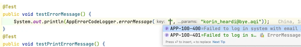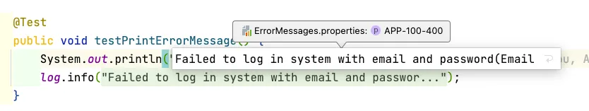 这样在任何地方如果你要打印错误消息的时候,这样log.info(AppErrorMessages.message("APP-100-400","xxx"));就可以。如果你还有想法和log进行一下Wrapper,如 log.info("APP-100-400","xxx"); ,也没有问题,样例代码如下:public class ErrorCodeLogger implements Logger { private Logger delegate; private static final String BUNDLE_FQN = "app.ErrorMessages"; private static final ResourceBundle RESOURCE_BUNDLE = ResourceBundle.getBundle(BUNDLE_FQN, new Locale("en", "US")); public ErrorCodeLogger(Logger delegate) { this.delegate = delegate; } @Override public void trace(@PropertyKey(resourceBundle = BUNDLE_FQN) String msg) { delegate.trace(RESOURCE_BUNDLE.getString(msg)); }}