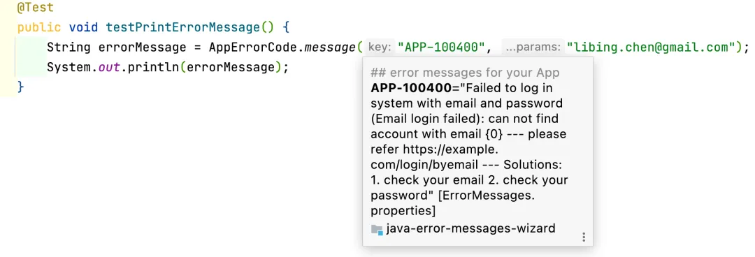 有了错误码和message的规范,接下来我们应该如何保存这些信息呢?如果是Java,是不是要创建对应的ErrorEnum,然后是一些POJO?这里个人建议使用properties文件来保存错误码和message的信息。文件名可以直接为ErrorMessages.properties,当然是在某一package下,文件样例如下:### error messages for your AppAPP-100-400=Failed to log in system with email and password(Email login failed): can not find account with email {0} --- please refer https://example.com/login/byemail --- Solutions: 1. check your email 2. check your passwordAPP-100-401=Failed to log in system with phone and pass(Phone login failed): can not find account with phone {0} --- please refer https://example.com/login/byphone --- Solutions: 1. check your phone 2. check your pass code in SMS