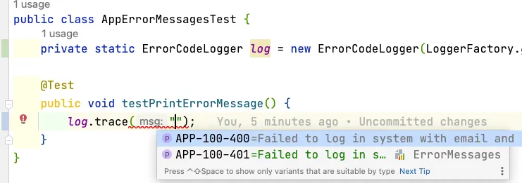 - 重构和查找支持:虽然Error Code是字符串,但是也是properties的key,所以rename这个error code,所有引用的地方都会rename。还支持find usage,那些地方引用了该error code等,都非常方便。当然如果Error Code在系统中没有被使用,也会灰色标识。
