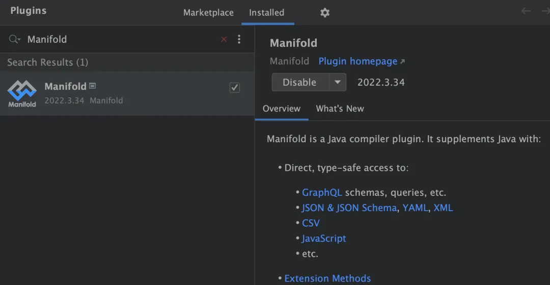 Manifold 的原理和 Lombok 是类似的,也是在编译期间通过注解处理器进行处理。所以要在 IDEA 中正确使用 Manifold,需要安装 Manifold IDEA 的插件:然后再在项目 pom 的 maven-compiler-plugin 中加入 annotationProcessorPaths:<project xmlns="http://maven.apache.org/POM/4.0.0" xmlns:xsi="http://www.w3.org/2001/XMLSchema-instance" xsi:schemaLocation="http://maven.apache.org/POM/4.0.0 http://maven.apache.org/xsd/maven-4.0.0.xsd"> ... <properties> <manifold.version>2022.1.35</manifold.version> </properties> <dependencies> <dependency> <groupId>systems.manifold</groupId> <artifactId>manifold-ext</artifactId> <version>${manifold.version}</version> </dependency> ... </dependencies> <!--Add the -Xplugin:Manifold argument for the javac compiler--> <build> <plugins> <plugin> <groupId>org.apache.maven.plugins</groupId> <artifactId>maven-compiler-plugin</artifactId> <version>3.8.1</version> <configuration> <source>8</source> <target>8</target> <encoding>UTF-8</encoding> <compilerArgs> <arg>-Xplugin:Manifold no-bootstrap</arg> </compilerArgs> <annotationProcessorPaths> <path> <groupId>systems.manifold</groupId> <artifactId>manifold-ext</artifactId> <version>${manifold.version}</version> </path> </annotationProcessorPaths> </configuration> </plugin> </plugins> </build></project>