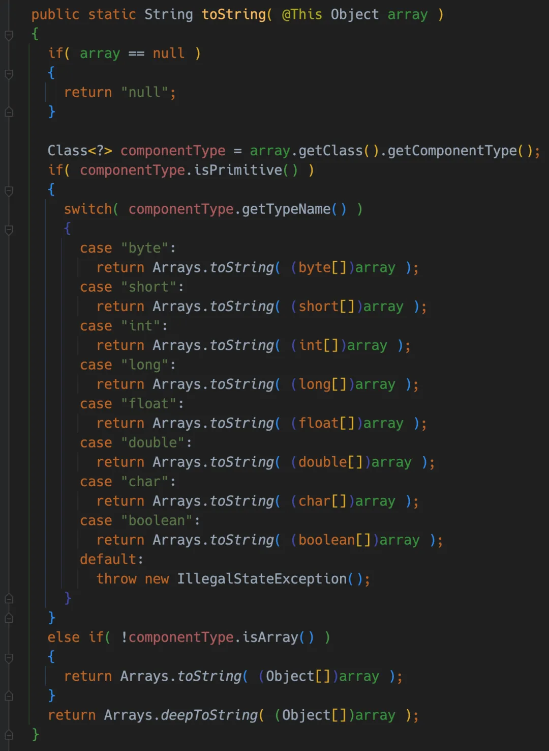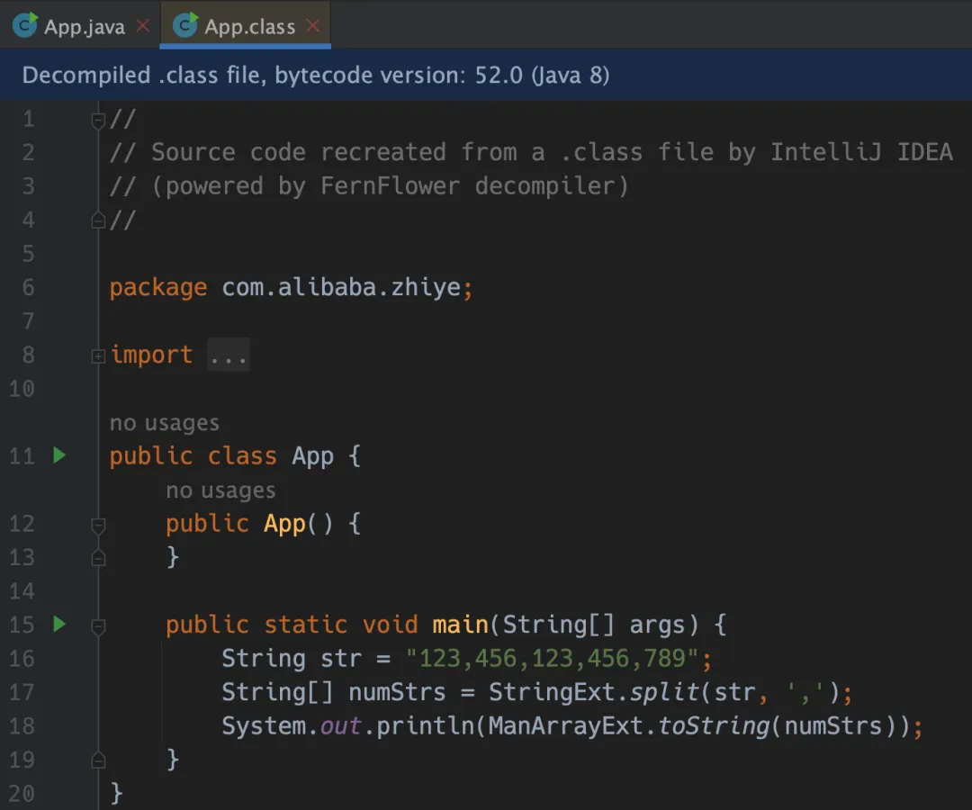 关于第 3 点,之所以有这个要求,是因为 Manifold 希望能快速找到项目中的扩展方法,避免对项目中所有的类进行注解扫描,提升处理的效率。Amazing!而且你可以发现,System.out.println(numStrs.toString()) 打印的居然是数组对象的字符串形式 —— 而不是数组对象的地址。查看反编译后的 App.class,发现是将扩展方法的调用,替换为静态方法调用:而数组的 toString 方法,使用的是 Manifold 为数组定义的扩展方法 ManArrayExt.toString(@This Object array):[Ljava.lang.String;@511d50c0 什么的,Goodbye,再也不见~