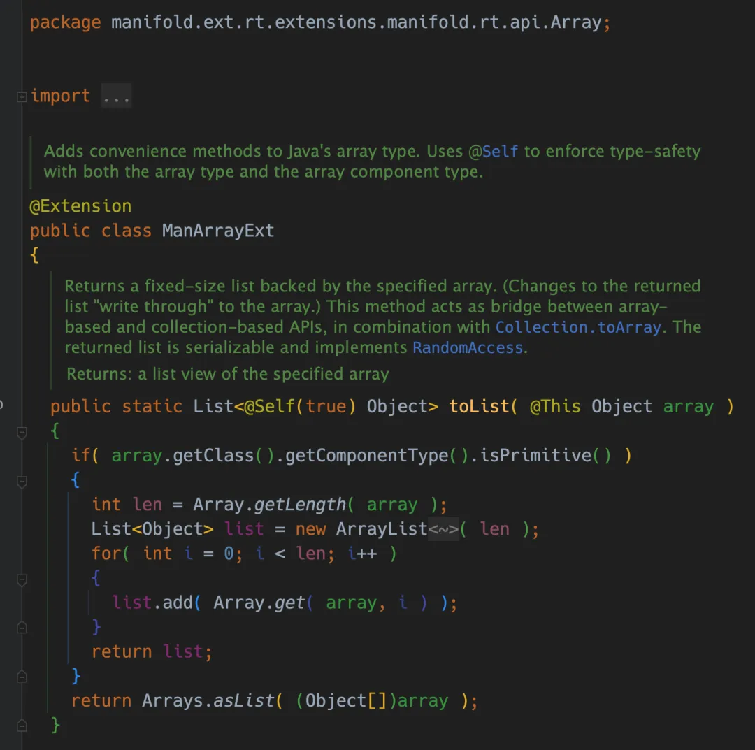 是不是很眼馋?因为如果用的不是 Java9 及以上版本(Java8:直接报我身份证就行),你就得用 Guava 之类的库 —— 然而 ImmutableList.of 用起来终究是比不上 List.of 这样的正统来的自然。没关系,Manifold 说:“无所谓,我会出手”。基于 Manifold 扩展静态方法,就是在扩展类的静态方法上,也加上 @Extension:package com.alibaba.aladdin.app.extensions.java.util.List;import manifold.ext.rt.api.Extension;import manifold.ext.rt.api.This;import java.util.Arrays;import java.util.Collections;import java.util.List;/** * List 扩展方法 */@Extensionpublic final class ListExt { /** * 返回只包含一个元素的不可变 List */ @Extension public static <E> List<E> of(E element) { return Collections.singletonList(element); } /** * 返回包含多个元素的不可变 List */ @Extension @SafeVarargs public static <E> List<E> of(E... elements) { return Collections.unmodifiableList(Arrays.asList(elements)); }}