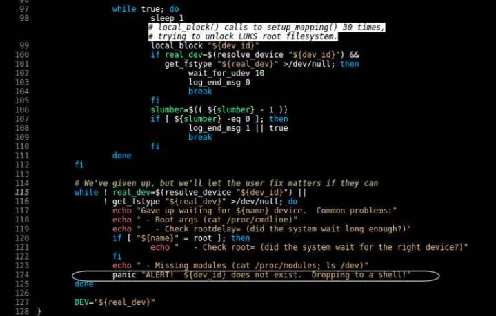 漏洞其实是出现在系统后Cryptsetup处理密码输入错误的时候,它会允许用户多次重试输入密码。而当用户输入错误93次后,程序就会给用户一个带root权限的shell(busybox)。