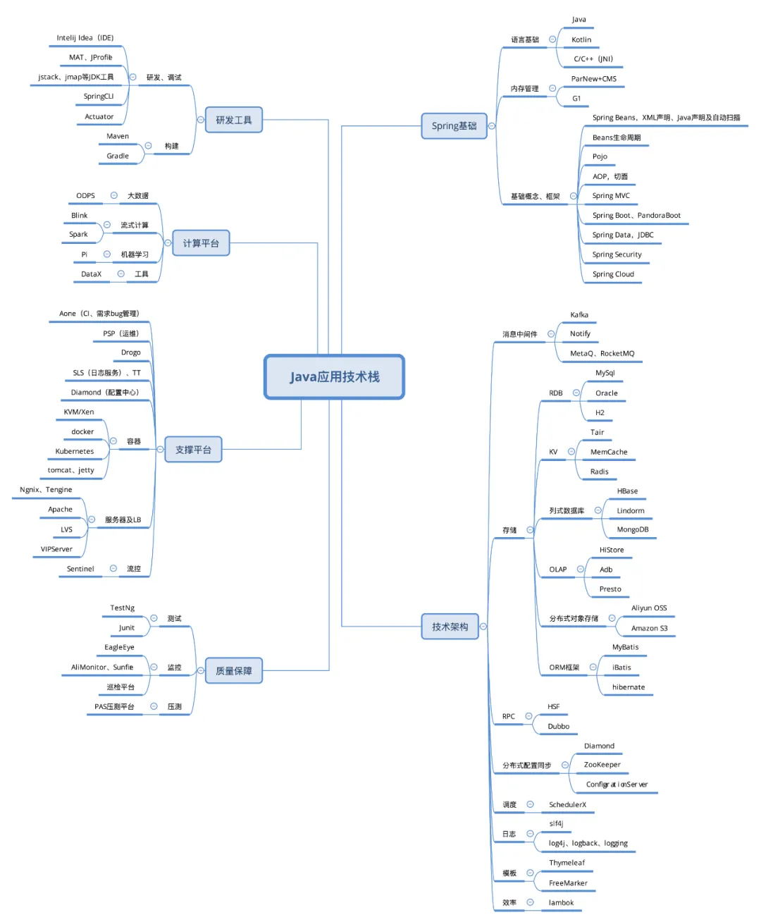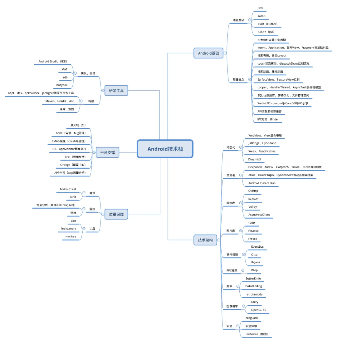 记得刚毕业那会儿,还是 BBA 争霸的年代,无线迎来一个黄金年代,如同当下的 “AI” 和更早些年的 “云”,什么事都需要往热点上靠一靠,基于 PC 的互联网公司们无不发出 all in 无线的战略口号,无线业务遍地开花,甚至一个公司每个产品线都恨不得出一个 App,直到现在再纷纷都向旗舰收拢,不过那都是后话了。2013 年,就是在那样的环境下,发生了几件事情:iPhone 5s 发布、Android 升级到 4.3 版本,以及......我毕业了,哈哈。作为校招新人,对长远职业规划、技术栈发展潜力并没有太多的认识,只是跟大多程序员一样,都是希望能跟随甚至推进业界的潮流,而不是以熟悉 Android 某个版本某个 API 得先设置个 false 否则会花屏这样的二手知识为荣,但是很不幸,由于种种选择和被选择,最后锚定了百度上海的校招研发岗位,一下子集齐了我最讨厌的两样东西:Java 和客户端!就这样也踉踉跄跄在 Android 客户端上耕耘了近 6 年之久,经历了 2.3 与 4.0 的兼容地狱,webkit 到 chromium 的升级、dvm 到 art 的转变以及热修复、各类动态部署狂潮,Android studio 也从 0.9 Beta 到如今的 4.0,并完全消灭了上古的 Eclipse + ADT,也算是有点感情了。直到去年,终于有机会拥抱了变化,得益于团队内有多个业务方向,避免了转岗入坑,顺利转战了 Java 应用战场,如今也快到 1 年了,突然也有些感想,与大家分享。陆续地,团队也有其他同学投入到了 Java 应用的怀抱,向着 “全栈” 开发发展,其中还不乏之前做 IOS 客户端开发的同学。闲暇之余,也会交流一些心得,比如 IOS 的同学会觉得 Android 转 Java 开发占了比较大的优势,从 IOS 转就会显得额外的困难,毕竟 OC 或 Swift 和 Java 大概长得完全不一样,但从一个前 Android Dev 的视角来看,我在这方面的感受是:当然,不能说的太绝对,不然容易招杠精,毕竟 Java 本身是为那些框架能力提供铺垫,客户端也用了 DVM(类 JVM)的 JNI 能力来做热修复,用了动态代理,甚至也有用 cglib、aspectJ 实现 AOP 的方案。但在一个生产环境中,一个语言本身提供的能力是完全不够的,一个语言是否能被广泛使用和接受,还有个主要因素就是得看生态,看社区,看大家贡献的库,这也是 Java 为什么虽然可能不是最好的语言,但仍然是使用最广泛的语言的原因,从这个角度看,它们之间,除了语言,真的没有太多相同的地方。以在阿里的生产环境为例,要做一个 Android 开发或者 Java 开发 “攻城狮”,你大概需要的知识图谱如下(图是根据自己的认知整理的,有不详尽甚至错误的地方望指出):