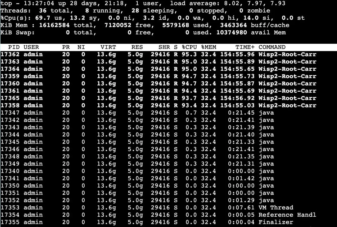Carrier线程是调度协程的线程,下方的- Coroutine [...]表示一个协程,active表示协程被调度的次数,steal表示被work stealing的次数,preempt表示时间片抢占次数。下图是DRDS在ecs上压测时的top -H,可以看出来应用的数百个线程被8个Carrier线程托管,均匀地跑在CPU核数个线程上面。下方一些名为java的线程是gc线程。误区1: 进内核引发上下文切换