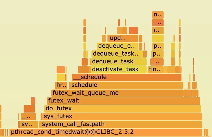 执行这段程序时上下文切换非常低,实际上上面的IO系统调用都是不会阻塞的,因此内核不需要挂起线程,也不需要切换上下文,实际发生的是用户/内核态的模式切换。上面的程序在神龙服务器测得每个pipe操作耗时约334ns,速度很快。本质上来说无论是用户态还是内核态的上下文切换都是很轻量的,甚至有一些硬件指令来支持,比如pusha可以帮助我们保存通用寄存器。同一个进程的线程共享页表,因此上下文切换的开销一般只有:既然近内核以及上下文切换都不慢,那么多线程的开销究竟在哪?我们不妨看一个阻塞的系统调用futex的热点分布: