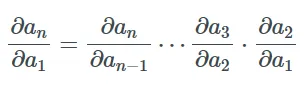 假设函数fi(ai)=ai+1由多于两个函数复合而成,我们可以反复应用公式求导并得到: