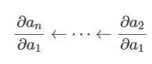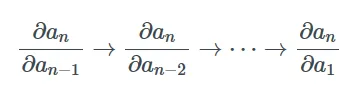 如果an是一个标量,那么在计算整个梯度的时候我们可以通过先计算∂an/∂an-1并逐步右乘所有的Jacobian矩阵∂ai/∂ai-1来得到。这个操作有时被称作VJP或向量-Jacobian乘积(Vector-Jacobian Product)。