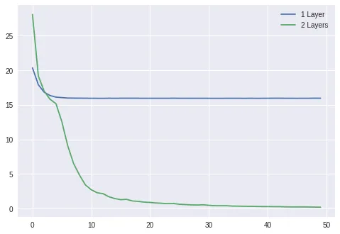 X = np.random.randn(1000, 2)Y = X[:, 0] * X[:, 1]losses1 = Learner( Sequential(Linear(2, 1)), mse_loss, SGDOptimizer(lr=0.01)).fit(X, Y, epochs=50, bs=50)losses2 = Learner( Sequential( Linear(2, 10), Sigmoid(), Linear(10, 1) ), mse_loss, SGDOptimizer(lr=0.3)).fit(X, Y, epochs=50, bs=50)plt.plot(losses1)plt.plot(losses2)plt.legend(['1 Layer', '2 Layers'])plt.show()
