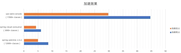 我们选择一些微服务、复杂依赖的业务场景典型 Demo 或内部应用,测试启动效果,发现应用普遍能降低 5%~45% 的启动耗时。若应用启动,存在下列场景,会有明显加速效果:- 类加载多(spring-petclinic 启动加载约 12000+ classes)