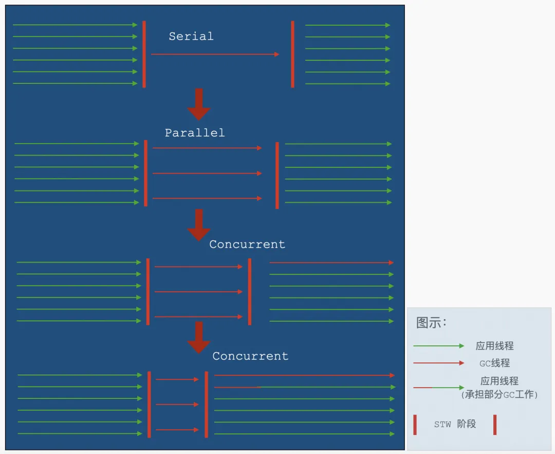JVM 自从诞生以来,以 “内存自动管理” 和 “一次编译到处运行” 两个杀手锏能力,外加 Spring 这个超级生态,在企业应用开发领域中一直处于“人人模仿,从未超越”的江湖地位。内存的自动管理从技术角度,用一句通俗的语言进行简述就是:“根据设计好的堆内存布局模型,采用一定的跟踪识别与清理的算法,达到内存自动整理及回收的效果”。而一代代内存管理技术不断演进的目标,就是在不断提升并发与降低延时的同时,寻找资源利用最优的方案,从某种意义上说,如果我们不带来一些突破性的算法,这个三者的关系如同分布式中的 CAP 定理一样,很难兼得。如下图所示:在 JVM 中,内存管理 趋近等同于 GC,GC 也是 Java 程序员获得一份工作时必考的知识点。其中 CMS 从 1.4 版本(2002年)开始引入,一度成为最为经典的 GC 算法。然而从 JDK9 开始发起弃用 CMS 的 JEP 提案,到 2020 年初发布的 JDK14 完全从代码中抹除,意味着在他成年之际正式宣告了他历史使命的结束。那么到现在我们又应该从什么角度上去理解这一技术领域的发展方向,今后面试官又会从哪些方面对我们发起提问,是不管技术如何演进,能确定的是变化主线是围绕着三个方向进行,分别是:堆内存布局、线程模型、收集行为。EDAS 团队经过一段时间整理出来了这篇文章,我们也将从三个点出发进行分享,希望能给大家一些启发。JVM 堆内存布局最为经典的是分代模型,即年轻代和老年代进行区分,不同的区域采用的回收算法和策略也完全不一样。在一个在线应用(如微服务形态)的 request <-> response 模型中,所产生的对象(Object)绝大多数是瞬时存活的对象,所以大部分的对象在年轻代就会被相对简单、轻量、且高频的 Minor GC 所回收。在年轻代中经过几次 Minor GC 若依然存活则会将其晋升到老年代。在老年代中,相比较而言由于对象存活多、内存容量大,所以所需要的 GC 时间相对也会很长,同时由于每一次的回收会伴随着长时间的 Stop-The-World (简称STW)出现。在内存需求比较大且对于时延和吞吐要求很高的应用中,其老年代的表现就会显得捉襟见肘。而且由于不同的分代所采用的回收算法一般都不一样,随着业务复杂度的增加,GC 行为变得越来越难以理解,调优处理也就愈发的复杂 。单纯从堆内存布局来理解,一个简单的逻辑是内存区域越小,回收效率越高,经典分代模型中的 Young 区已经印证了这一点。为了解决上述问题,G1 算法横空出世,引出基于区域(Region)的布局模型,带来的变化是内存在物理上不再根据对象的“年龄”来划分布局,而是默认全部划分成等大小的 Region 和专门用来管理超级大对象的独占 Region,年轻代和老年代不再是一个物理划分,只是一个 Region 的一个属性。直观理解上,除了能管理的内存更大(G1 理论值 64G)之外,这样带来一个显而易见的好处就是可以预控制一次 FullGC 的 STW 的时间,因为 Region 大小一致,则可以根据停顿时间来推算这次 GC 需要回收的 Region 个数,而没有必要每次都将所有的 Region 全部清理完毕。随着这项技术的进一步发展,到了现代化的 Pauseless(ZGC) 的算法场景中,有些算法暂时没有了分代的概念,同时 Region 按照大小划分了 Small/Medium/Large 三个等级,更精细的 Region 管理,也进一步来更少的内存碎片和内存利用率的提升、及其 STW 停顿时间更精准的预测与管理。说线程模型之前,先简单提一下 GC 线程与业务线程,GC 线程是指 JVM 专门用来处理 GC 相关任务的线程,这在 JVM 启动时就已经决定。在传统的串行算法中,是指只有一个 GC 线程在工作。在并行(Parallel)的算法中,存在多个 GC 线程一起工作的情况(CMS 中 GC 线程个数默认是 CPU 的核数)。同时一些算法的某些阶段中(如:CMS 的并发标记阶段),GC 线程也可以和业务线程一起工作;这个机制就缩短了整体 STW 的时间,这也是我们所说的并发(Concurrent) 模式。在现代化的 GC 算法中,并不是所有和 GC 相关的任务都只能由 GC 线程完成,如 ZGC 中的 Remap 阶段,业务线程可以通过内存读屏障(Read Barrier),来矫正对象在此阶段因为被重新分配到新区域后的指针变化,进而进一步减少 STW 的时间。收集行为是指的在识别出需要被收集的对象之后,JVM 对于对象和所在内存区域如何进行处理的行为。从早期版本至今,大致分为以下几个阶段:- Mark Copy:是指直接将存活对象从原来的区域拷贝至另外一个区域。这是一种典型的空间换时间的策略,好处显而易见:算法简单、停顿时间短、且调参优化容易;但同时也带来了近乎一倍的空间闲置。在早期的 GC 算法使用的是经典的分代模型。其中对于年轻代 Survivor 区的收集行为便是这种策略。