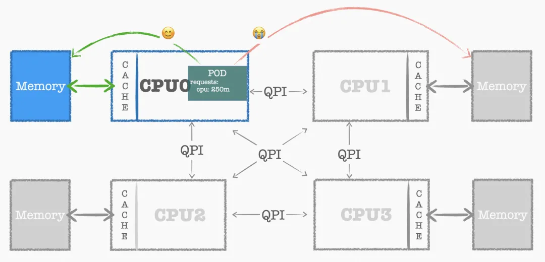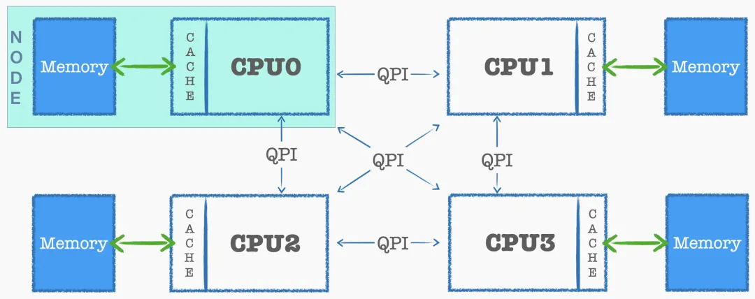 对于云原生场景云原生的内在推动力之一是让我们的业务工作负载最大化的利用云所带来的技术红利,云带来最大的技术红利就是通过弹性等相关技术,带来我们资源的高效交付和利用,从而降低最终的经济成本。所以如何最大化的利用资源的弹性能力是很多技术产品所追求的其中一个目标。这一小节,我们抽取了 JDK9 - JDK 19 中内存相关的代表性能力,分别是:G1 NUMA-Aware、Elastic Metaspace、ZGC Uncommit Unused Memory。和大家一起感受一下 JVM 在新的技术趋势下如何拥抱和改变。现代化的服务器大多是属于多 Node 的架构,下图表示有 4 个 Node,每一个 Node 内部都会有相应的 CPU(有的架构会有多个 CPU) 和对应的物理内存条。当 CPU 访问访问本 Node 内部的物理内存进行“本地访问”时,其速度是通过 QPI 访问其他节点内存时的速度接近两倍,同时不同远近 Node 的访问速度也都不一样。在开启 NUMA 的情况下,每个 Node 内的 CPU 将优先使用同 Node 内的“本地”内存,否则系统将所有 Node 内的内存统一对待进行随机分配和访问。既然 Numa 的作用是 CPU 将尽量访问“本地”内存以加速内存访问速度,常规场景下如果我们需要使用这个能力,在系统开启 Numa 的前提下,我们还需要对运行的程序进行绑核调优等操作,以将应用程序运行的进程和CPU有一个绑定关系。要达到这一效果,除了系统提供了一些运维管理工具(如 linux 中的 taskset 命令)之外,程序也可以通过调用系统 API (如 linux 中的 pthread_setaffinity)。在 JVM 多线程的模型中,如果想要通过自动编程的方式来进行 CPU 绑定,当下只能选择带有特定能力的商业版本,在 OpenJDK 中还不能很方便的完成这一能力。那 JVM 内对于 Numa 能做什么呢?这里有一个假设,在一个线程内运行的对象大部分都是瞬时的(即这个对象的作用域跟随创建它的线程(或 Runnable)的运行结束而消亡),原因和我们在上面介绍堆内存布局模型时的新生代的选择是一样逻辑。基于这个假设,JVM 主要聚焦在了解决新生代的内存分配和访问的 Numa 感知上。其实 JVM 对于 Numa 的支持很多年前就开始了,在 YoungGC 的并行(Parrallel)收集器(通过-XX:+UseParallelGC开启)中。开启 Numa 之后,JVM 优先选择 Node 内部的“本地”内存进行新对象的创建。在云原生场景下,一个 Kubernetes 集群通常托管高规格的机器、同时高密的部署的小规格的工作负载,这个场景下,一个工作负载一直运行在同一个 CPU 或固定几个 CPU 的场景会变得越来越普遍。如果 JVM 再把整个 Worker 的内存不加区分的对待并进行分配,我们的内存访问性能势必会急剧下跌。如下图所示:G1 算法通过 JEP 345 在 JDK 14 中得到了这一能力的支持,可通过参数 -XX:+UseNUMA开启,开启之后,G1 会尽量将固定大小的各个 Region 均摊在所有能分配的 CPU Node 中,在分配新对象时,将优先使用同一 Node 内的“本地”内存的 Region,如果“本地”内存 Region 不够时,将对此 Region 触发一次 GC;如果还不够,再按照 CPU 的远近尽量获取相邻 Node 的 Region。此策略只针对 G1 中新生代的内存区域生效。老年代区域和大对象区域还是沿用默认的策略。JEP 387: Elastic Metaspace