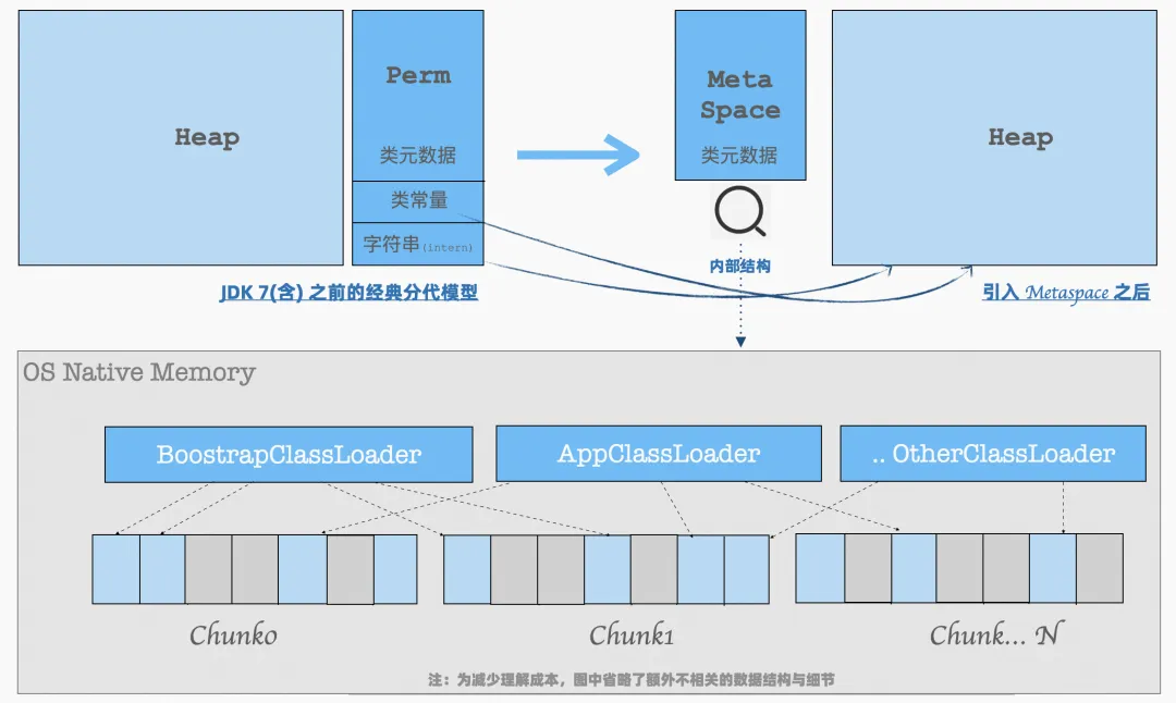 - 内存布局调整:与之前在堆中开辟一块区域相比,Metaspace 是直接使用操作系统的本地内存进行分配,本地内存划分成多个 Chunk,以 ClassLoader 为维度进行分配和管理。