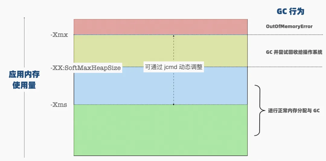ZGC 在 JDK 11 时被引入,它是一款基于内存区域(Region) 布局的垃圾回收器,我们可以通过 -XX:+UseZGC进行开启。作为一款主打 Pauseless 的现代化的收集器,ZGC 相比于 G1 除了提供了三个不同大小的 Region (2M/4M/8M,而 G1 为一个固定大小的值)进行管理之外,还因为在 GC 整理阶段提供了内存读屏障来矫正对象指针的技术使得最终的 STW 时间更短。但是在 JDK 14 之前,被清理的 Region 还是无法归还给操作系统,相比 G1 在 JDK9 中就提供了类似的能力滞后了两年多。简单概述一下,这个 JEP 指的是每次 GC 结束,JVM 都会尝试将释放一部分内存归还给操作系统。但是如上一章节介绍 Elastic Metaspace 章节一样,频繁的向操作系统 申请/归还 只能带来更多的系统开销,如何取舍是一门艺术。那么该如何选择是否有操作手段呢?请先看下面这张图:首先,系统提供了一个额外的 JVM 的调整参数(SoftMaxHeapSize)来控制回收的行为,这个值应该在 -Xms 和 -Xmx 之间,当系统使用的内存低于这个值时,就是正常的收集行为,即只会进行清理和压缩。而大于这个值但是小于 -Xmx 时,FullGC 结束之后就会尝试回收空闲的内存区域(Region) 归还给操作系统。达到的效果是 ZGC 将尽量保证整体堆内存水位处于这个值之下。默认情况下这个值和 -Xmx 的大小是一致的。同时由于这个值是一个可动态调整(managable)的变量,随着系统的运行,当我们发现需要进行调整的时,在认真评估之后,可以通过 jcmd VM.set_flag SoftMaxHeapSize <bytes> 命令动态进行调整。其次,上述方案虽然很完美的将选择权交给了应用管理人员,但是运行的过程中也会出来一种情况:如果应用真实的使用量如果恰好在 SoftMaxHeapSize上下徘徊的时候,会造成很频繁的系统内存的申请和释放。这个时候提供了另外一个策略,就是可以通过 -XX:ZUncommitDelay 来设置一个回收之前的延时,即不在 GC 结束马上进行尝试回收,而是等一段时间(默认 5 分钟)后再进行回收,以免造成误伤。到这里,所有相关的云原生场景解读就完了;整个读下来,自己的感觉是 JVM 在这个场景下除了更好的去融入到这个场景之外,而且还不断的摒弃自己原有的即使是很成熟经典的设计,层层蜕变,在云原生场景下不断的将技术价值释放出来。云原生潮涌来,我借用孙子兵法中的一句话与各位共勉:“故善战人之势,如转圆石于千仞之山者,势也。”。回到我们的场景通俗理解就是你会看到你的合作伙伴、你的客户、你所使用的工具链、甚至你找的下一份工作时面试官的问题,都在受到这一理念与技术的影响而做出改变,这是技术浪潮中的大势。如对上述话题感兴趣想深入探讨,欢迎留言或加入钉群:21958624 与我们( EDAS 团队)进行沟通与交流,云原生微服务应用平台 EDAS 始终致力于应用架构云原生化,2023 春季新推采购活动,新客户头两月不限量使用,助力大家缩短转型过程中的路径。写评测赢Airpods 2,OCR文档自学习评测上线!