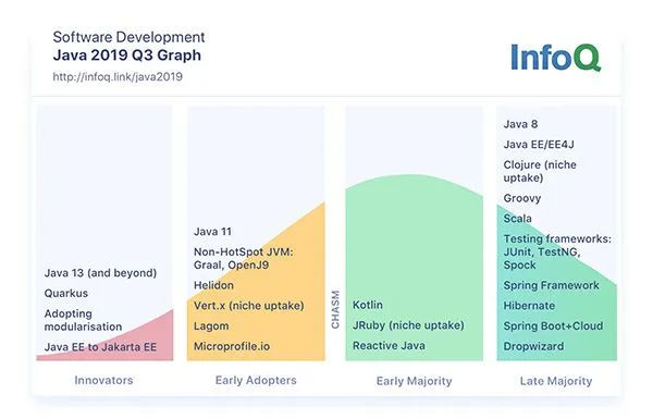 关于 Java,我也不确定该怎么说。我所知道的是,非 LTS 版本的采用量非常有限,它们或许可以被放在创新者阶段,但很奇怪的是,它们当中有些已经进入 EOL 阶段。不管怎样,我认为 Java 8 仍然处在晚期大众阶段,Java 11 在早期采用者阶段,Java 11 在创新者阶段?