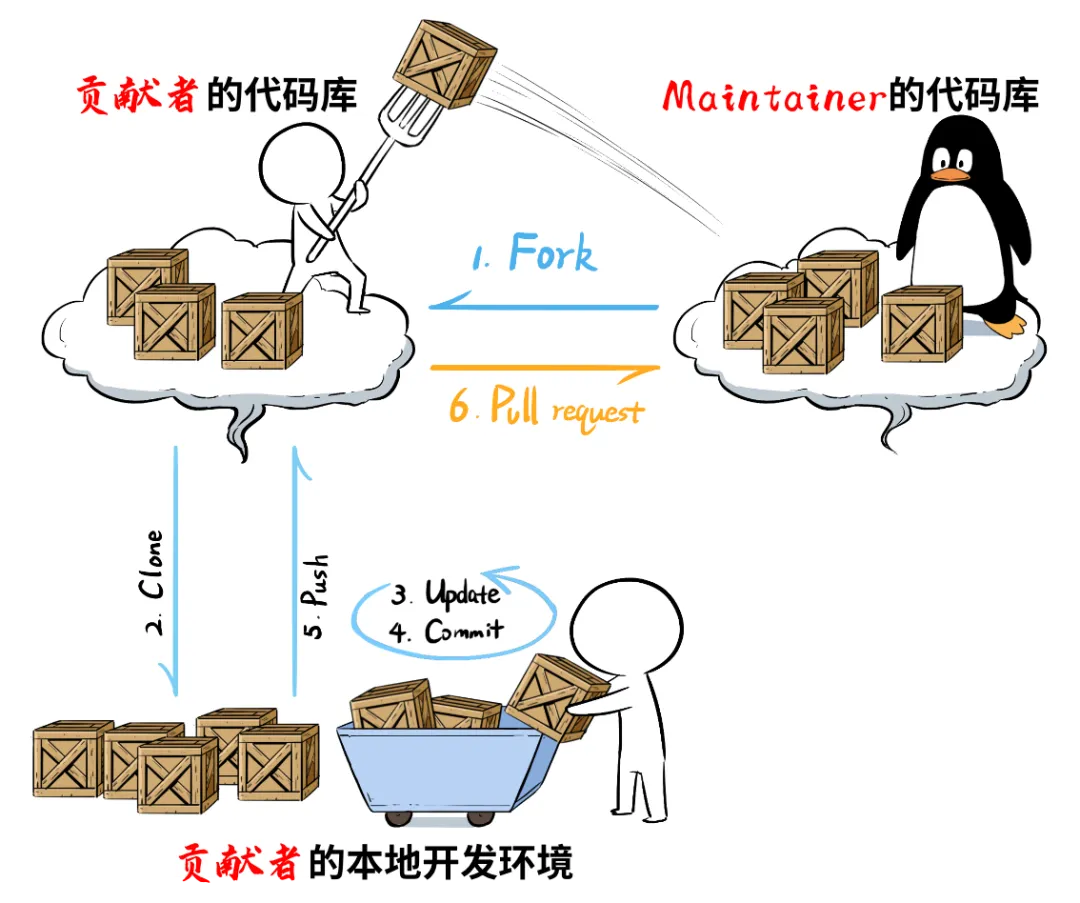 看一下“贡献”流程:贡献者从Maintainer的代码库中,Fork一份代码到自己的库中,然后Clone到本地电脑上,修改、提交,再push到自己的代码库中,随后,向Maintainer发起Pull request请求。