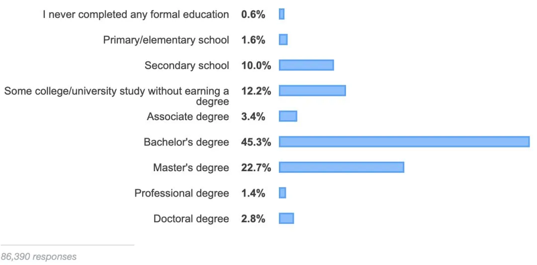 从世界范围来看,大约四分之三的受访专业开发者拥有学士或更高学位,这与历届调查结果保持一致。然而,没有完成学位也取得成就的专业开发者也并不少见。