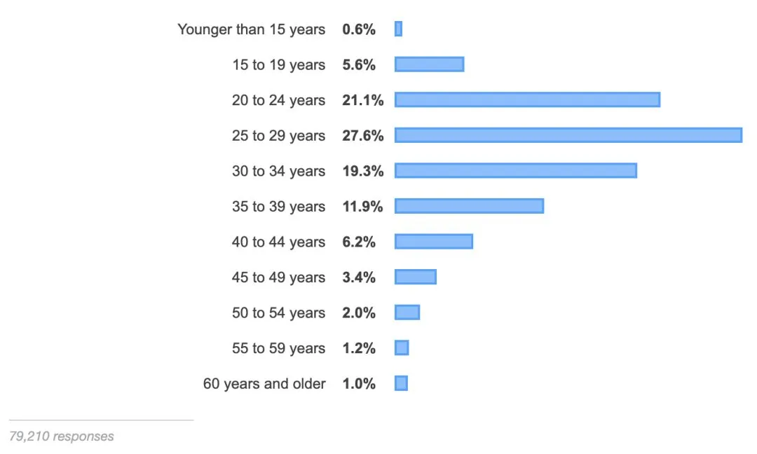 20-35 岁的开发者仍然是全球软件行业的中坚力量,占比接近 70%。