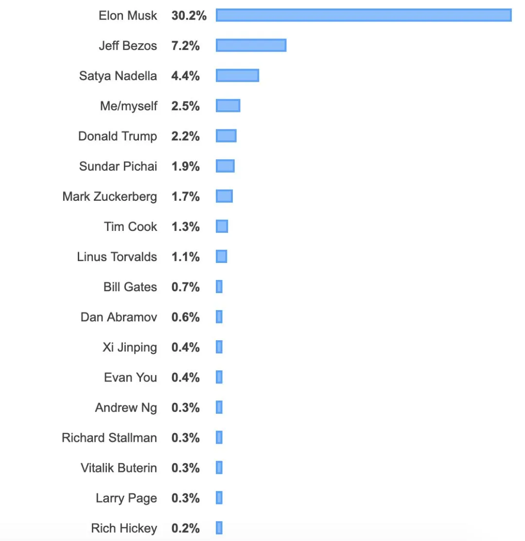 我们询问受访者谁是 2019 年最有影响力的人。除了特斯拉、亚马逊、微软、谷歌、Facebook 和 Apple 等公司的 CEO 外,受访者提到了构建和维护 React.js 和 Vue.js(今年最受欢迎的 web 框架)的开发者,以及 Linux 世界和其他技术领域的领导者。受访者也提到了几位世界领袖,同时相当多「谦虚的」受访者提名他们自己……只有一名女性位居该名单的前 25 位,她是 AMD 公司 CEO 苏姿丰。