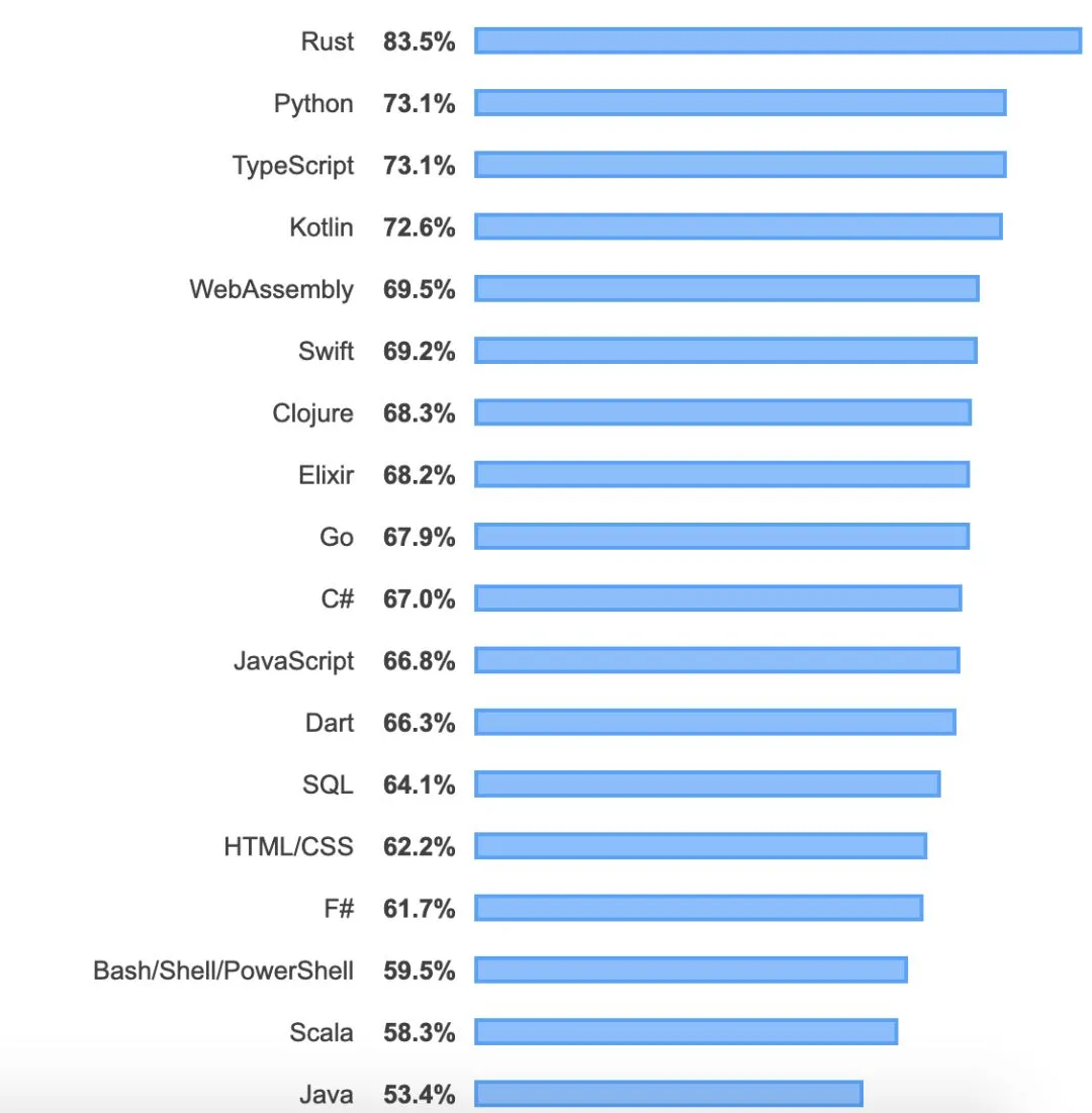 Rust 连续四年成为最受受访者喜爱的编程语言,紧接着是现在增长最快的主要编程语言 Python。这意味着,相较于其他编程语言,更多开发者愿意继续使用这两种编程语言。